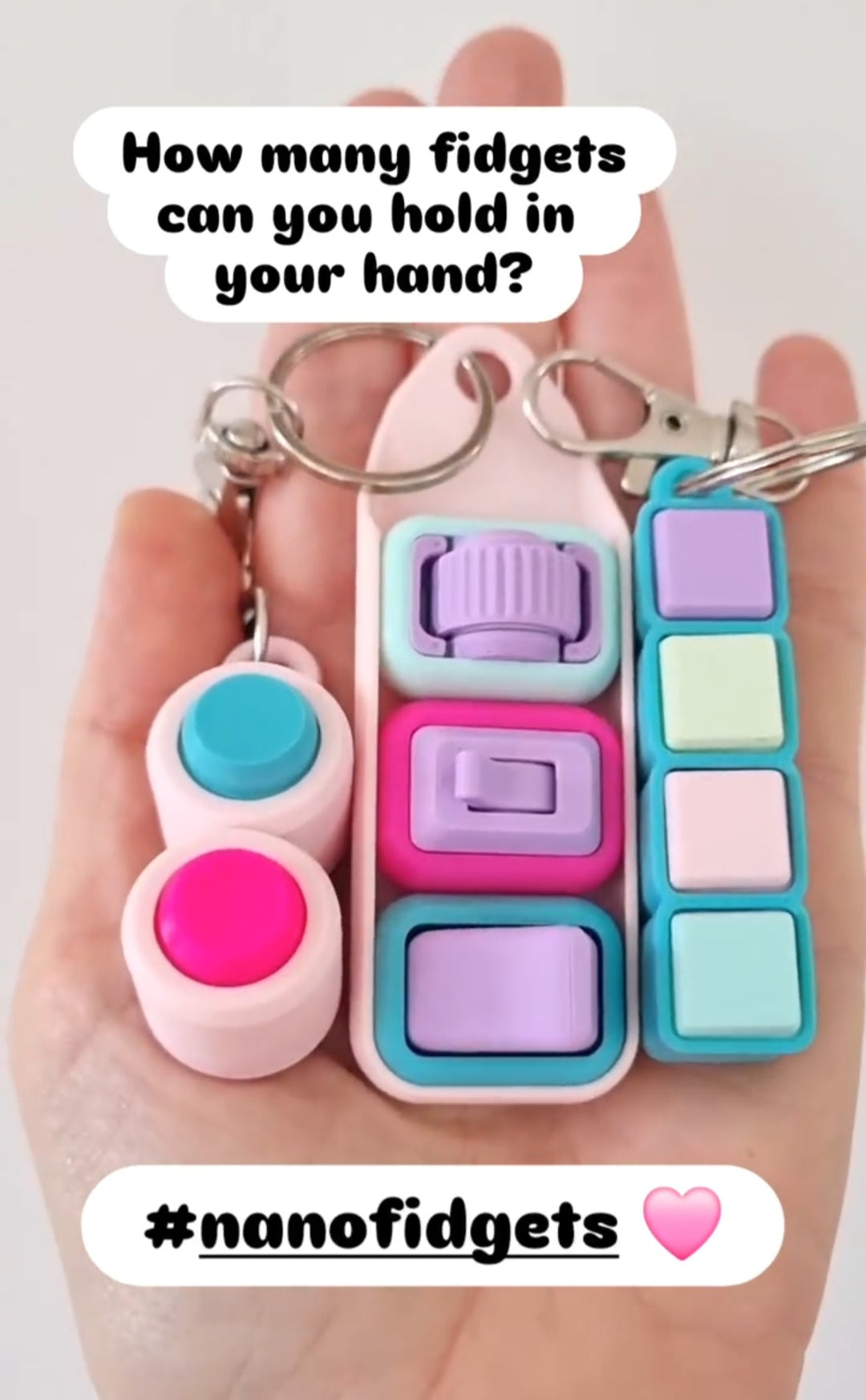 This bundle contains the nano duo clicker, the nano 4 clicker palette and the keychain fidget holder with 3 nano fidgets of 360 wheel, flick switch and flicker. You can opt to have the duo clicker and palette as keychains.